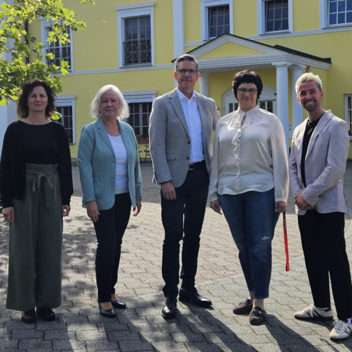 Das Leitungsteam um Elmira Schwickardi (2.v.r.) mit Hesena-Geschäftsführer Sascha Saßen (m.) und Integrationsmanager Toni Christ (r.) im Palais Dorndorf
