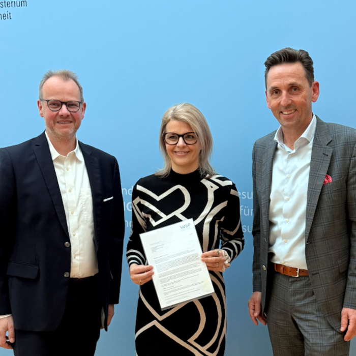 Der vor wenigen Monaten gegründete "Verband Digitale Standards in der Pflege" (VDSP) fordert einen Booster von neun Milliarden Euro für ein Investitionsprogramm der ambulanten und stationären Pflege. Finanziert werden sollte es aus dem Sondervermögen, so die beiden VDSP-Vorstände, Andreas Fischer (rechts) und Carsten Steinhoff (links), als sie der Pflegebeauftragten Katrin Staffler (Mitte) einen Forderungskatalog im Bundesgesundheitsministerium übergeben haben.
